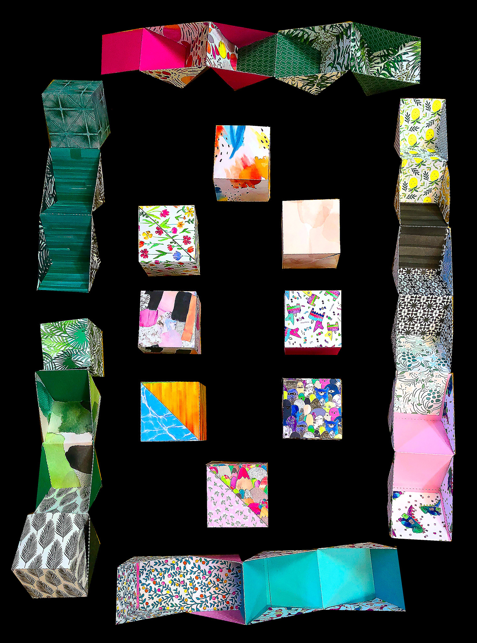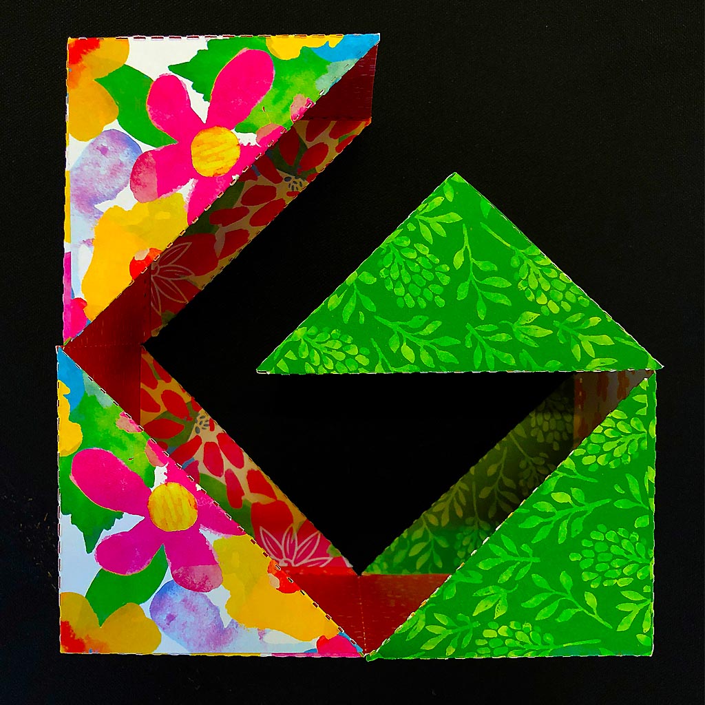 The hinged nested boxes that make up a Roly Poly book are constructed with triangular components. Math, Aesthetics and Engineering are inherent in each progressively smaller boxes as they unfold. Inspired to recreate one, I ordered a few Roly Poly books as soon as I got home. I then challenged myself to figure out the precise net drawing for these boxes without taking apart the purchased ones. With the help of Math and LOTS of prototyping, I figured it out!