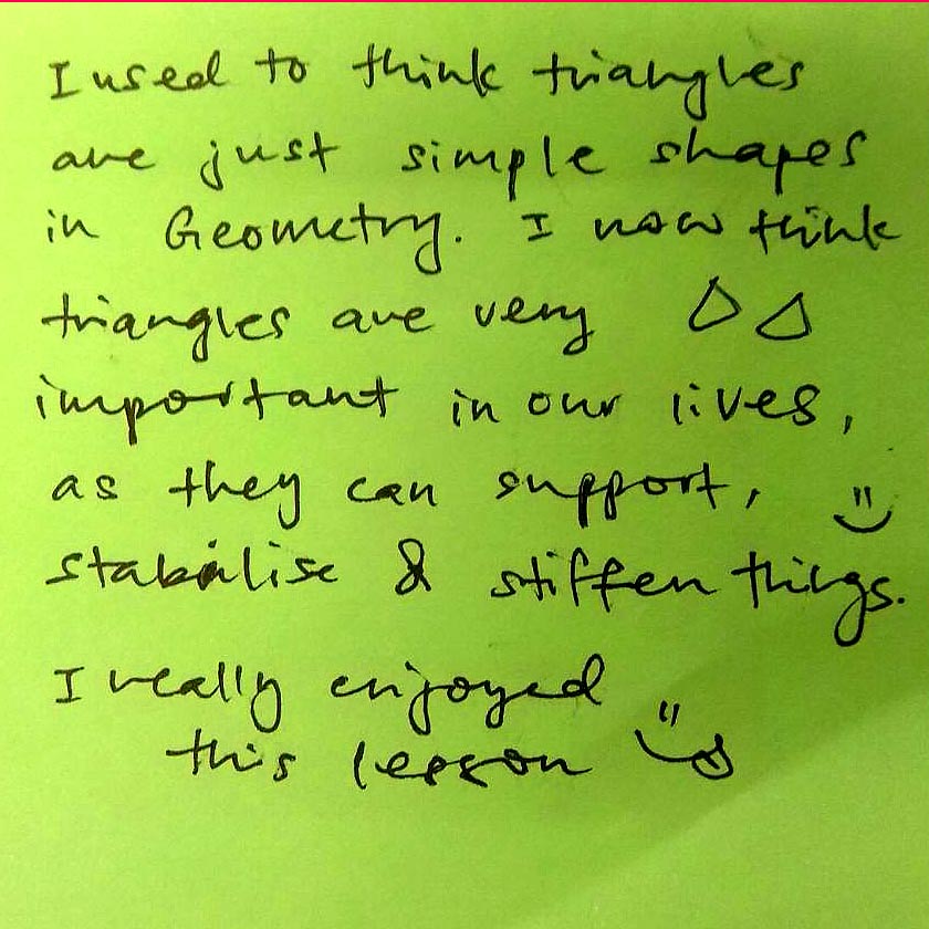 A wonderful teaching and learning experience with them involved a Sec 2 NYGH Math teacher who partnered with me in my Makerspace, for a lesson about the strength of triangles. During the lesson, the Teacher first shared Math concepts with the students, then I engaged them with cutting beautiful papers using an analog die cutting machine. Students completed their hands-on project by folding and assembling the triangles into fabulous Roly Poly boxes.